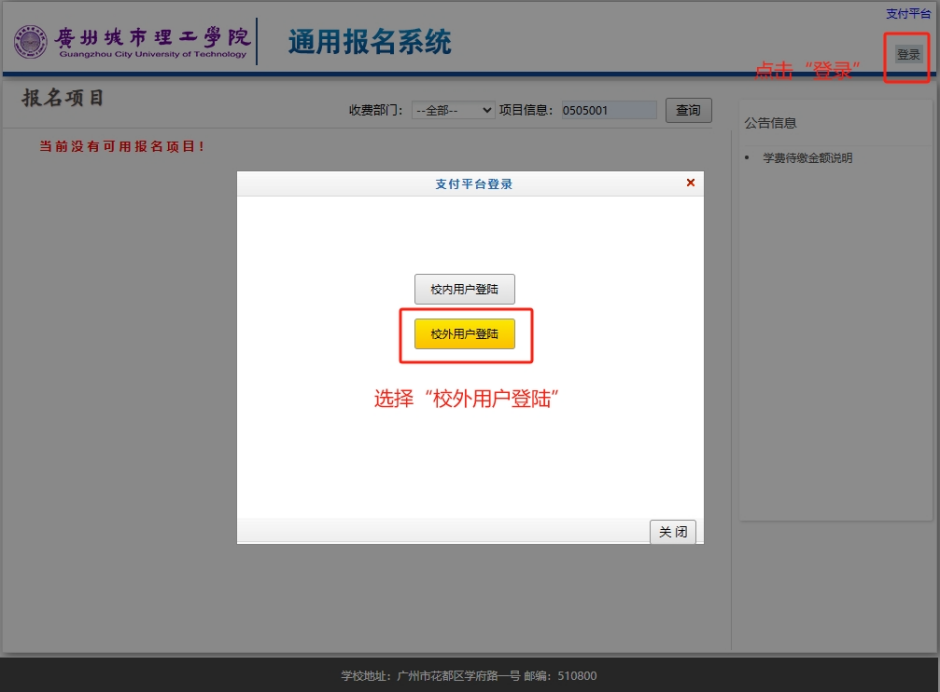 (1)考生需注册“校外用户登录”账号,点击网页http://cwc-zfpt.gcu.edu.cn/xysf/进入学校“通用报名系统”,点击右上角“登录”,选择“校外用户登陆”(考生需注册“校外用户登陆”账号)