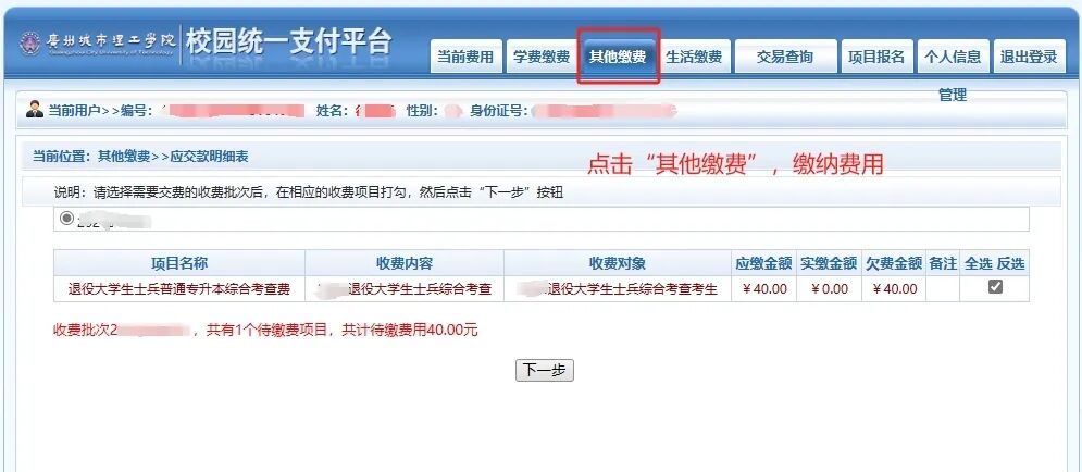 (5)进入统一缴费平台,选择“其他缴费”缴纳综合考查费40元/科